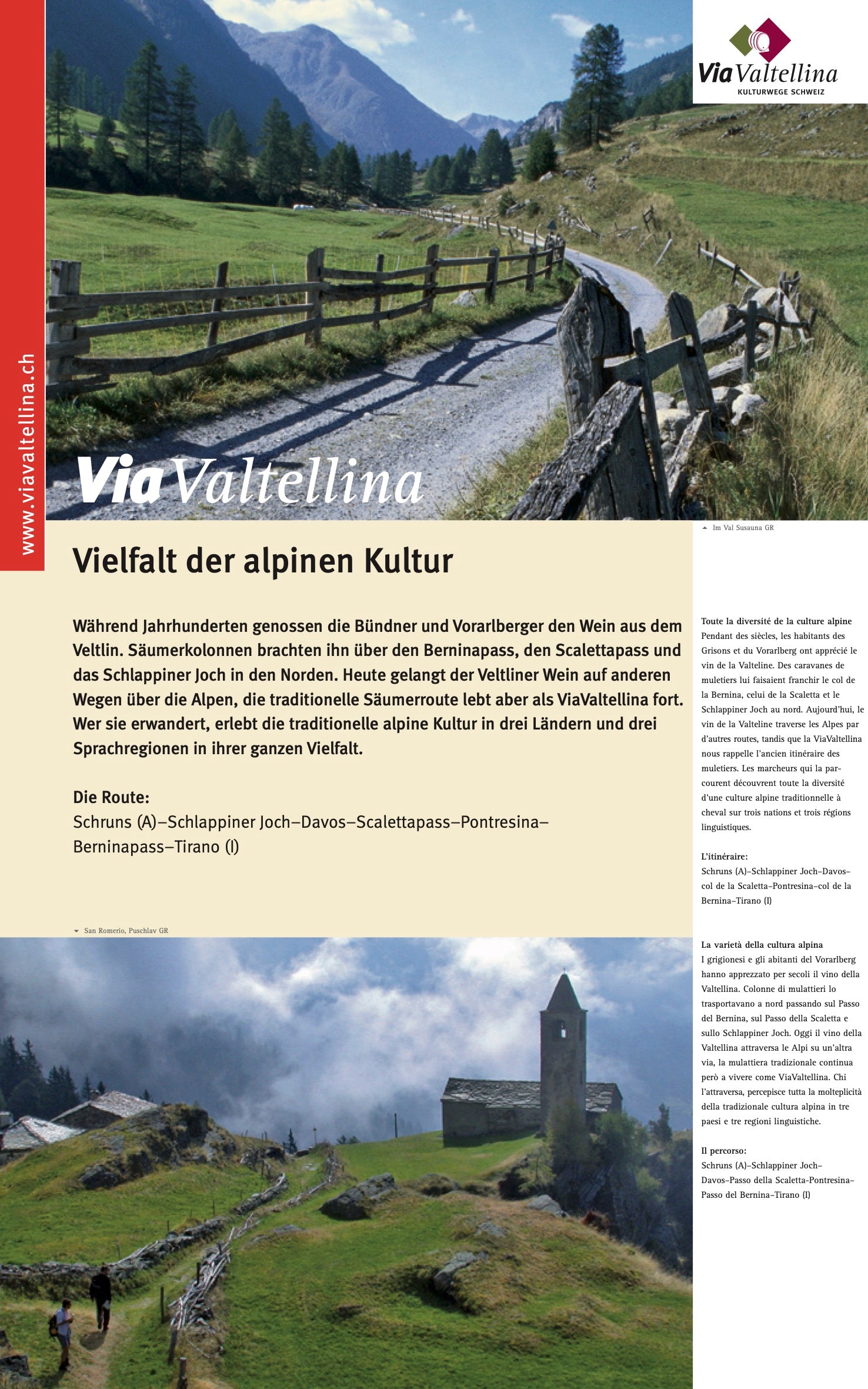 Depuis des siècles, on apprécie le vin de la Valteline dans les Grisons et dans le Vorarlberg. Autrefois, des convois de muletiers le transportaient vers le nord en passant par le col de la Bernina, le col de la Scaletta et le Schlappiner Joch. Aujourd'hui, le vin de la Valteline emprunte d'autres chemins pour traverser les Alpes, mais la route traditionnelle des muletiers perdure sous le nom de ViaValtellina.