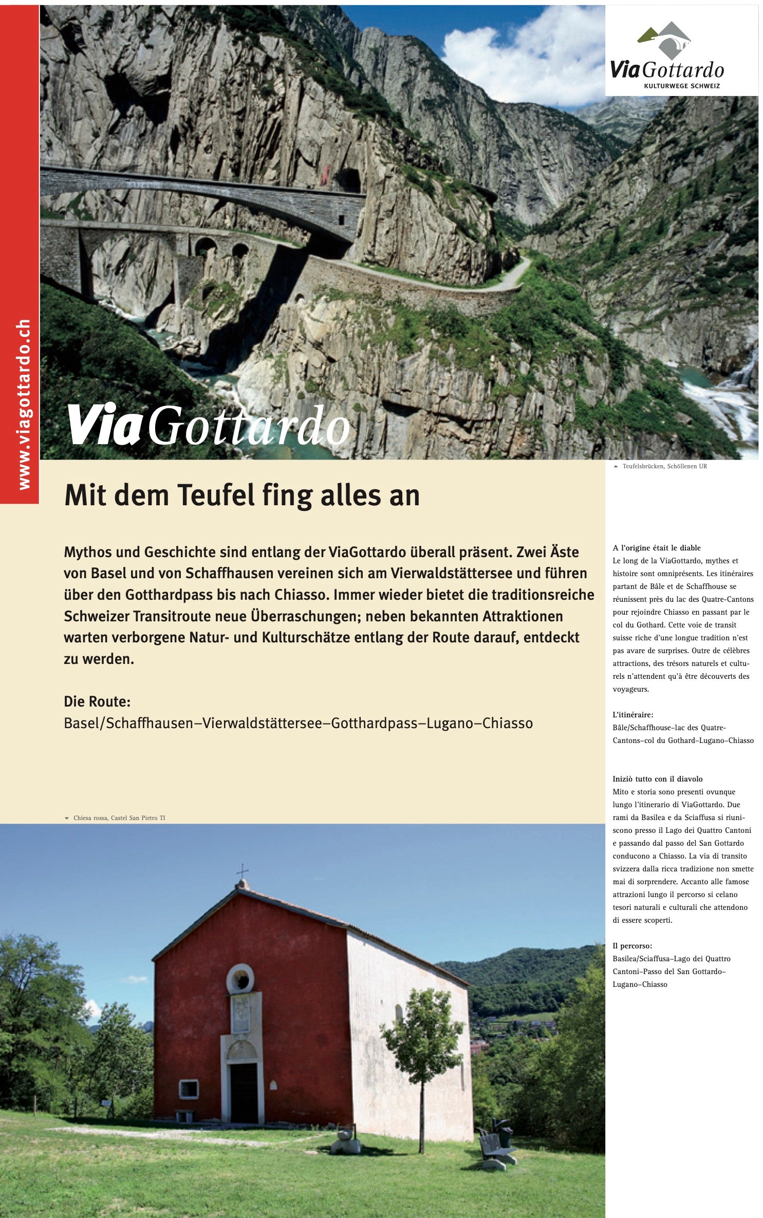 Was wäre der Gotthardpass ohne seine Zufahrten? Aus drei Richtungen erreicht die ViaGottardo den zentralen Alpenpass: von Chiasso im Süden, von Schaffhausen im Nordosten und von Basel im Nordwesten der Schweiz. Unterwegs lassen sich vielfältige Spuren dieser Verkehrsbeziehungen entdecken.